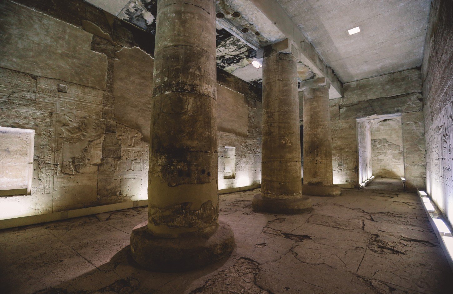 アビドス神殿: オシリス神を中心とした宗教儀式の聖地で、壁画にはエジプト王朝のファラオたちのリストや、壮麗な宗教的モチーフが描かれています。